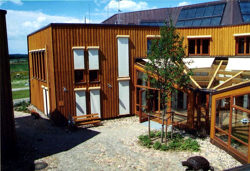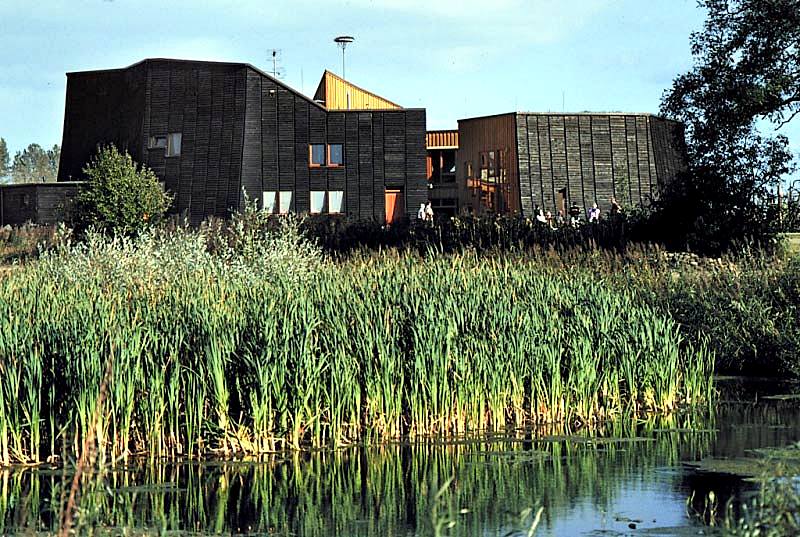 Das Zentrum liegt ein paar Kilometer außerhalb in einer von der Eiszeit geprägten Naturlandschaft mit Hügeln, Wald und Teichen. Der durchbrochene, kreisrunde Bau mit der Holzfassade fällt sofort auf.